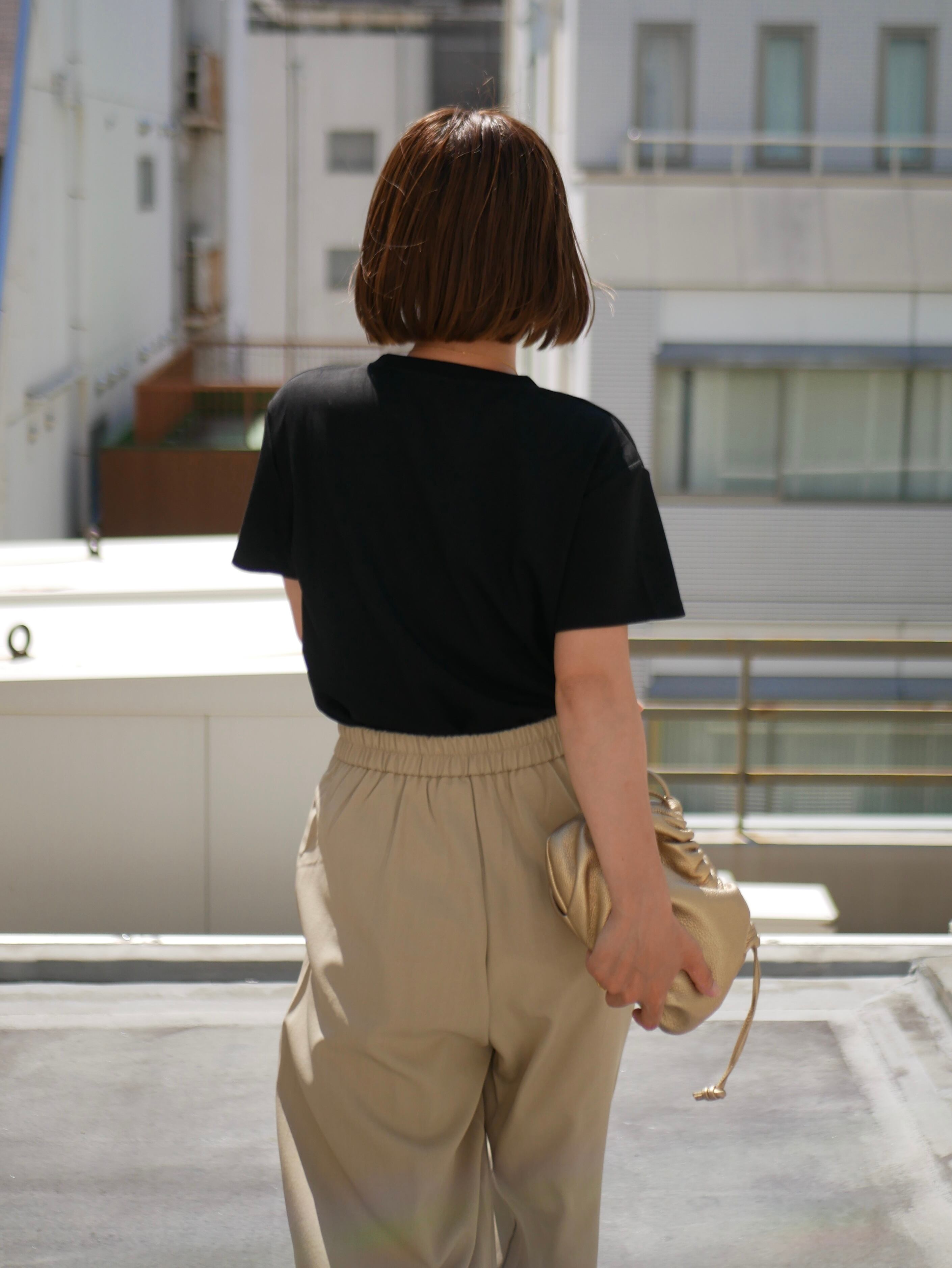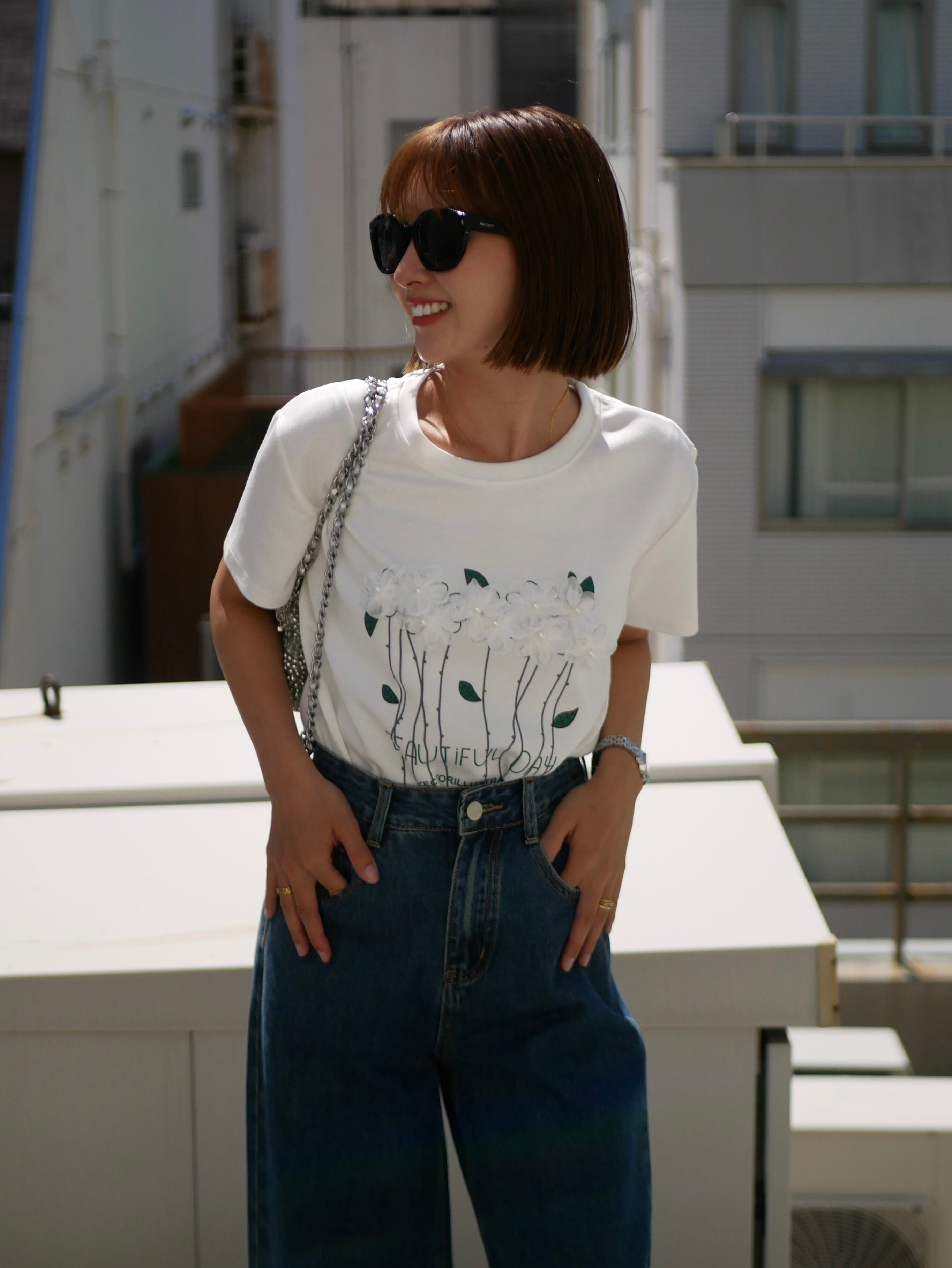 立体的なフラワーモチーフが特徴のデザインTシャツです。胸元には、オーガンジー素材の立体的なお花があしらわれており、中心には小さなパールビーズが施され、上品でフェミニンな印象を演出します。花の茎と葉はプリントで表現されており、ナチュラルで可憐な雰囲気を持っています。